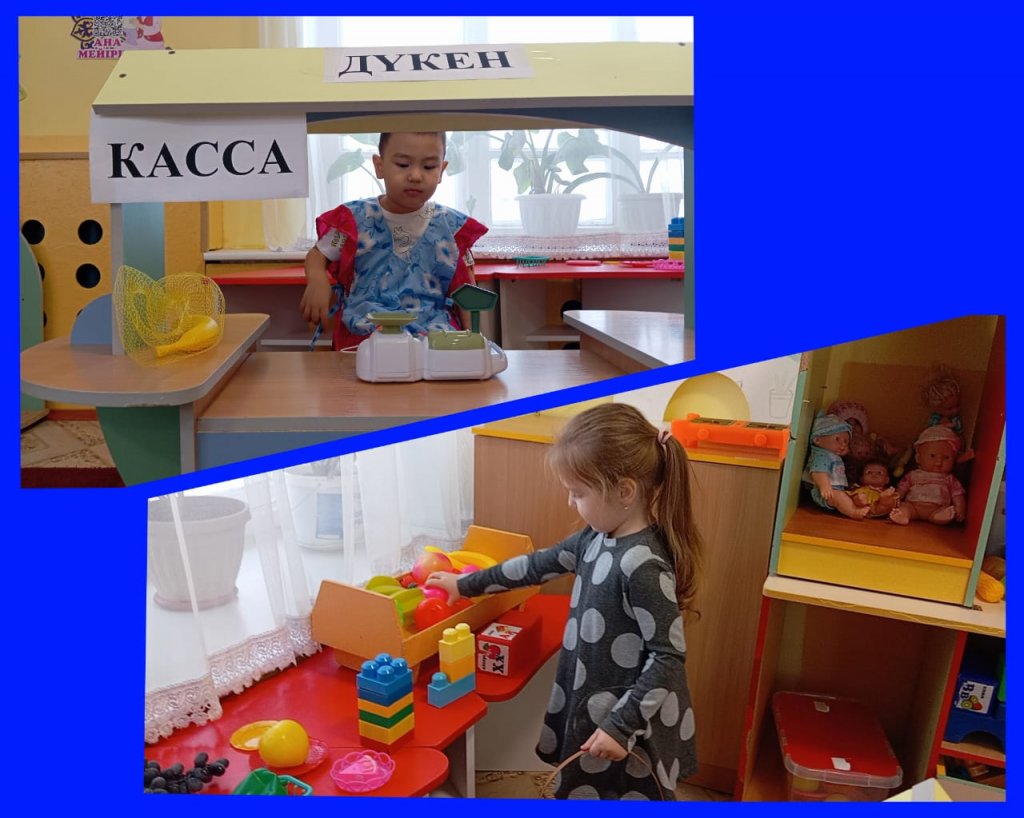 Балабақшадағы "Дүкен" рөлдік ойыны. Рөлдік ойын мектепке дейінгі білім беру процесінде маңызды орын алады. Балаларға ең сүйікті және пайдалы ойындардың бірі - "Дүкен" ойыны, өйткені ол әр балаға жақын және түсінікті, нақты өмірлік жағдайларды бейнелейді және мектеп жасына дейінгі баланың жеке басының жан-жақты дамуына ықпал етеді. Ойынның мақсаты: Балаларда сатушы мен сатып алушының кәсібі туралы идеяларды қалыптастыру, коммуникативті дағдыларды дамыту, құрдастарымен қарым-қатынас жасау, ойын әрекеті арқылы әлеуметтік тәжірибені байыту. "Дүкен" рөлдік ойынының міндеттері: ойын рөлдерін қабылдау және орындау қабілетін дамыту; сыпайы қарым-қатынас дағдыларын қалыптастыру (сәлемдесу, сұрау, алғыс); "Дүкен" тақырыбы бойынша сөздік қорын кеңейту; қарапайым математикалық көріністерді бекіту (шот, салыстыру, сатып алу ақысы) ; қоғамдық орындарда мінез-құлық мәдениетін тәрбиелеу; тәуелсіздікті, бастаманы және қиялды дамыту.